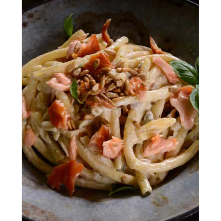 Bigoli al salmone, crema di gorgonzola e semi di girasole